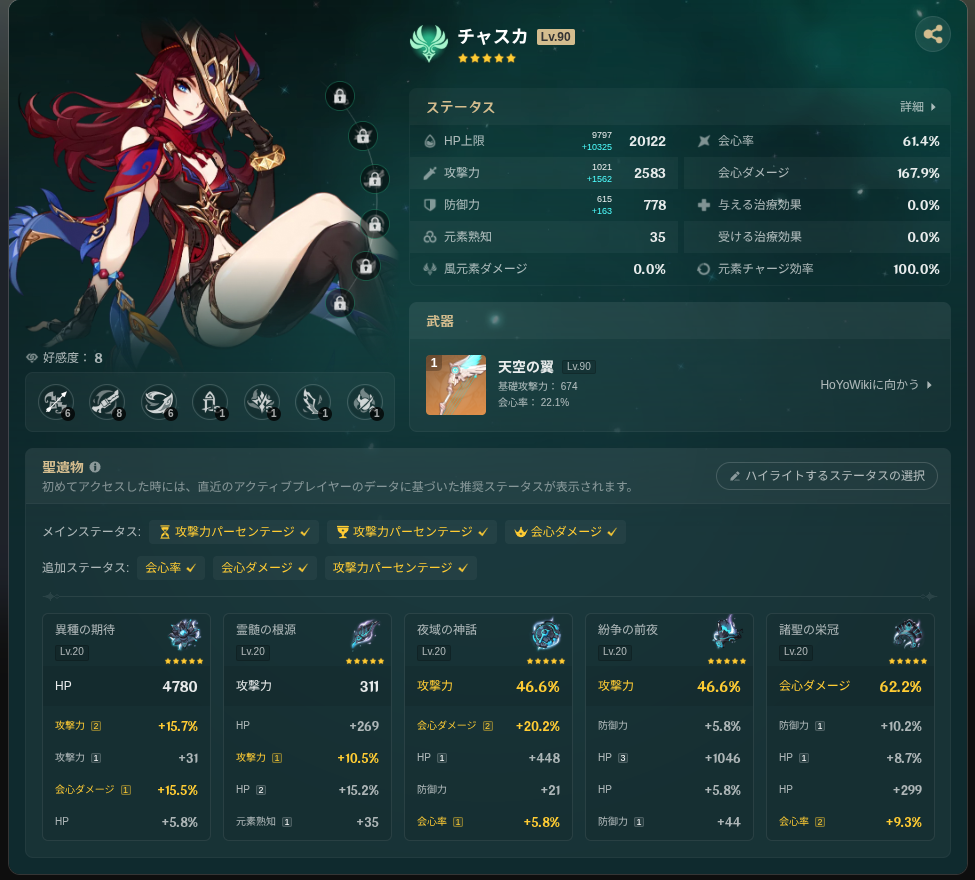 チャスカはこんな感じだが、風元素キャラクターで、元素スキルが編成した各キャラクターの元素を弾丸にして発射するという特異なスキルを持っている。